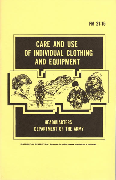 This manual is a guide for those who use, care for, or maintain clothing and equipment issued or sold for personal use. It includes general instructions for cleaning, pressing, repairing, and storing items of the uniform. Uses of bovouac equipment, such as the shelter half, sleeping bag, and poncho, are discussed. Methods of assembling, packing, and using load-carrying equipment are also discussed. The use and care of various items of field equipment issued for special purposes or missions are also covered in this manual. General information, with references for specific information, is included on clothing for use in arctic, tropical, and other special environments.